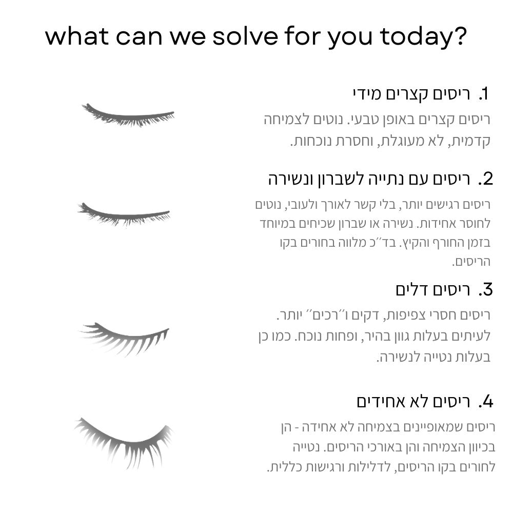 תמיד הייתה לי בעיה עם הריסים שלי ושוםפתרון אחר לא סיפק אותי עד שפגשתי אותכם באינסטגרם. זה הצליח ואני רואה ריסים מלאות יותר וארוכות יותר. שרק תצליחו ❤️